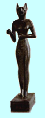 Il fut donc vénéré sous la forme de la déesse Bastet, représentée tantôt comme sous forme de chatte, tantôt sous forme de femme à tête de chatte, tenant un sistre à la main droite et portant un ou deux anneaux d’or.